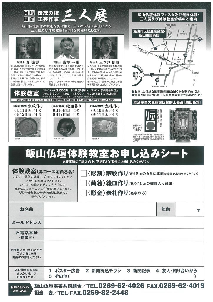 飯山仏壇製作の技術を受け継ぐ、三人の伝統工芸士による三人展及び体験教室(有料)が開催されます。