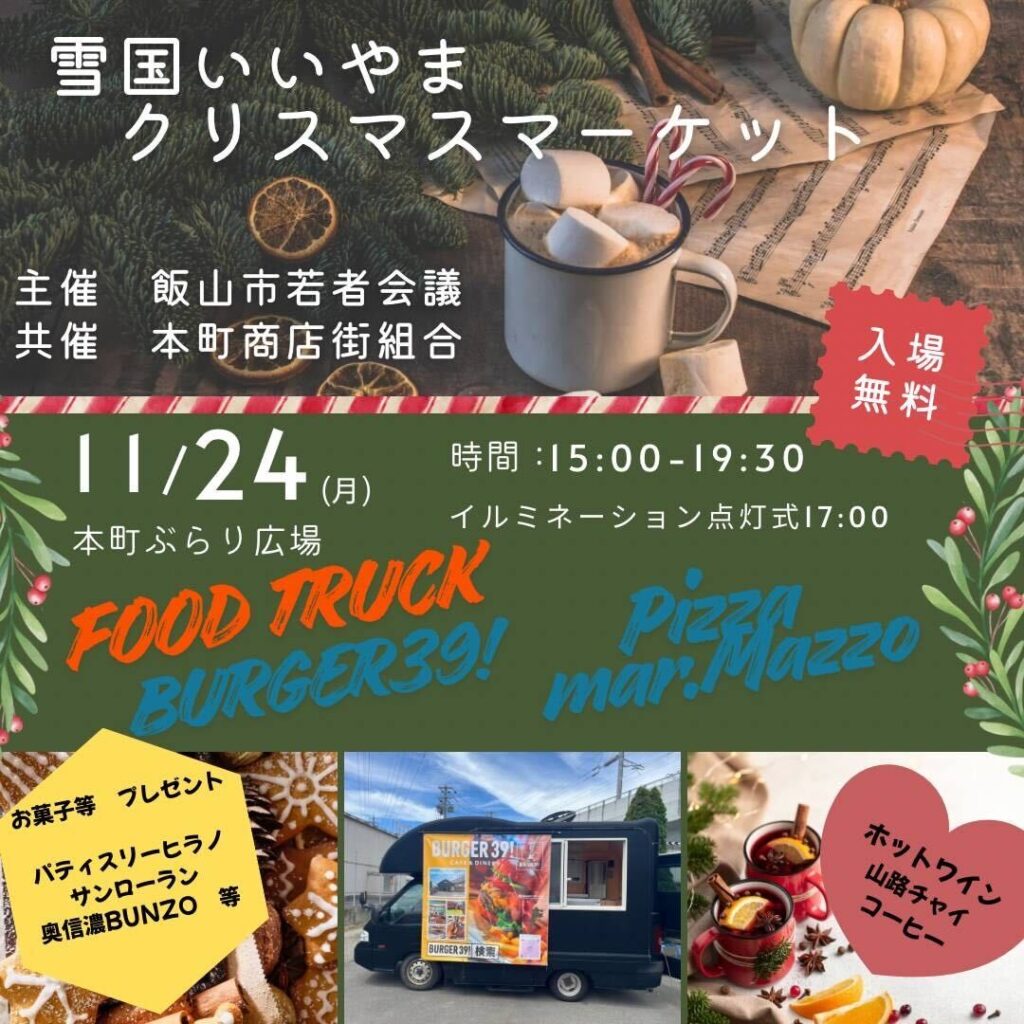 2025年11月24日(月)に本町ぶらり広場にて「雪国いいやま クリスマスマーケット」が開催されます。