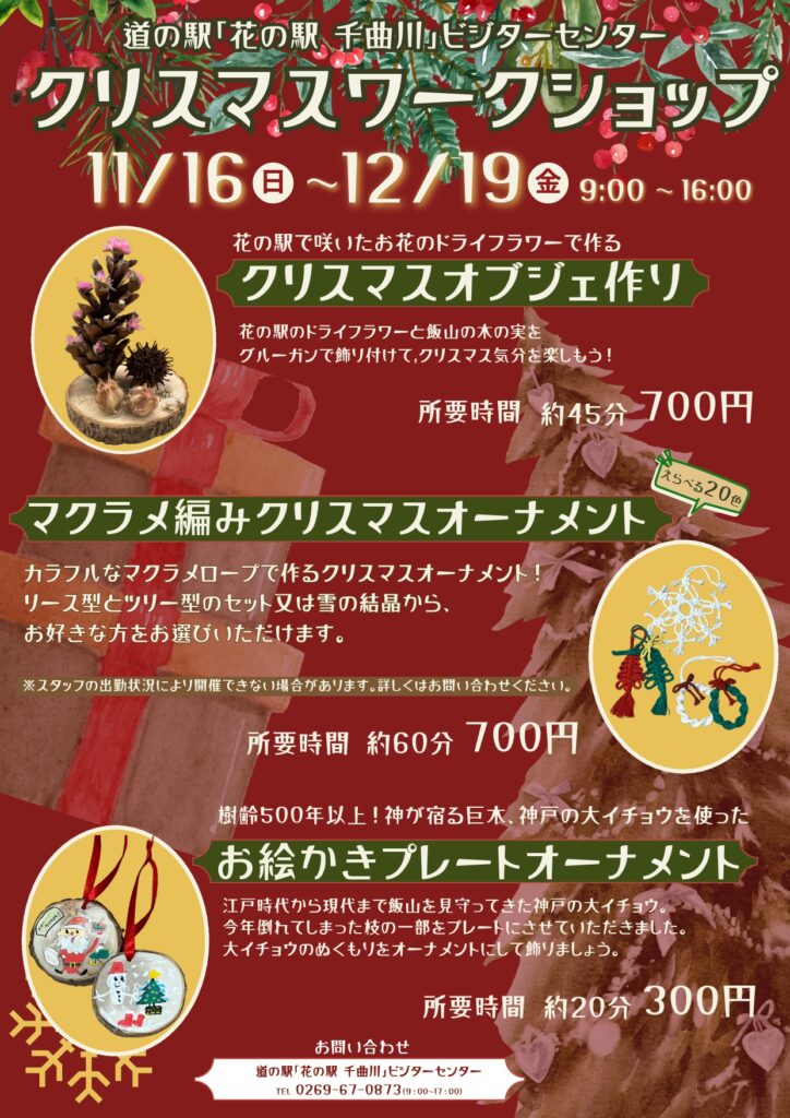 道の駅「花の駅 千曲川」ビジターセンターでは、11月16日(日)〜12月19日(金) のあいだ、クリスマスの準備にぴったりなワークショップを開催します。