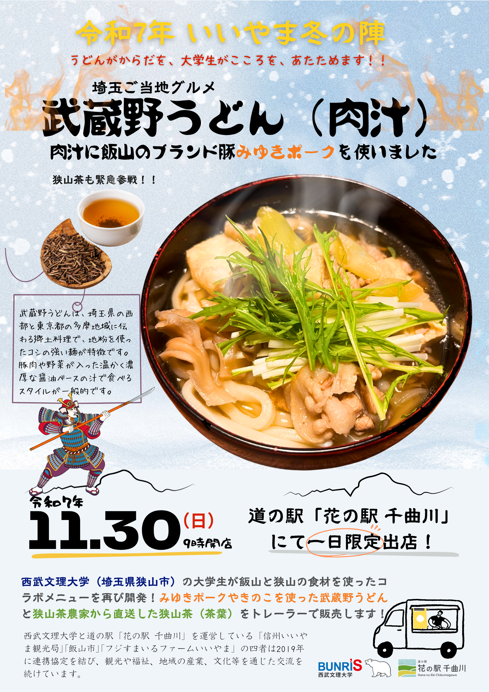 この度、その連携事業の一環として、道の駅「花の駅 千曲川」 にて、西武文理大学の学生による「武蔵野うどん(肉汁)」と「狭山茶(茶葉)」の試飲・販売会を開催します。