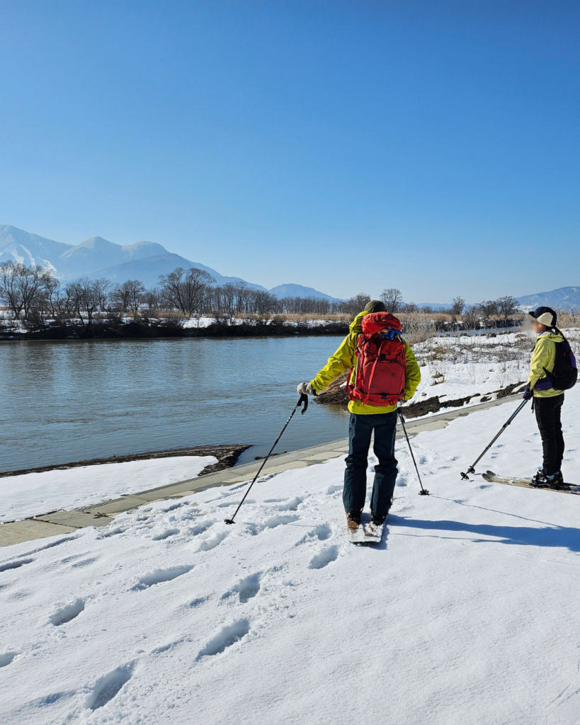 当日は、雪化粧をした北信の山々や千曲川の雄大な風景を楽しみながら雪原を散策。