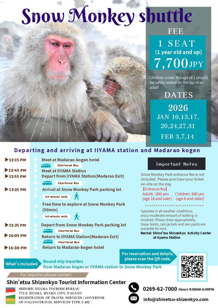 本シャトルバスは、斑尾高原~飯山駅~地獄谷野猿公苑を直通で結ぶ期間限定の運行です。