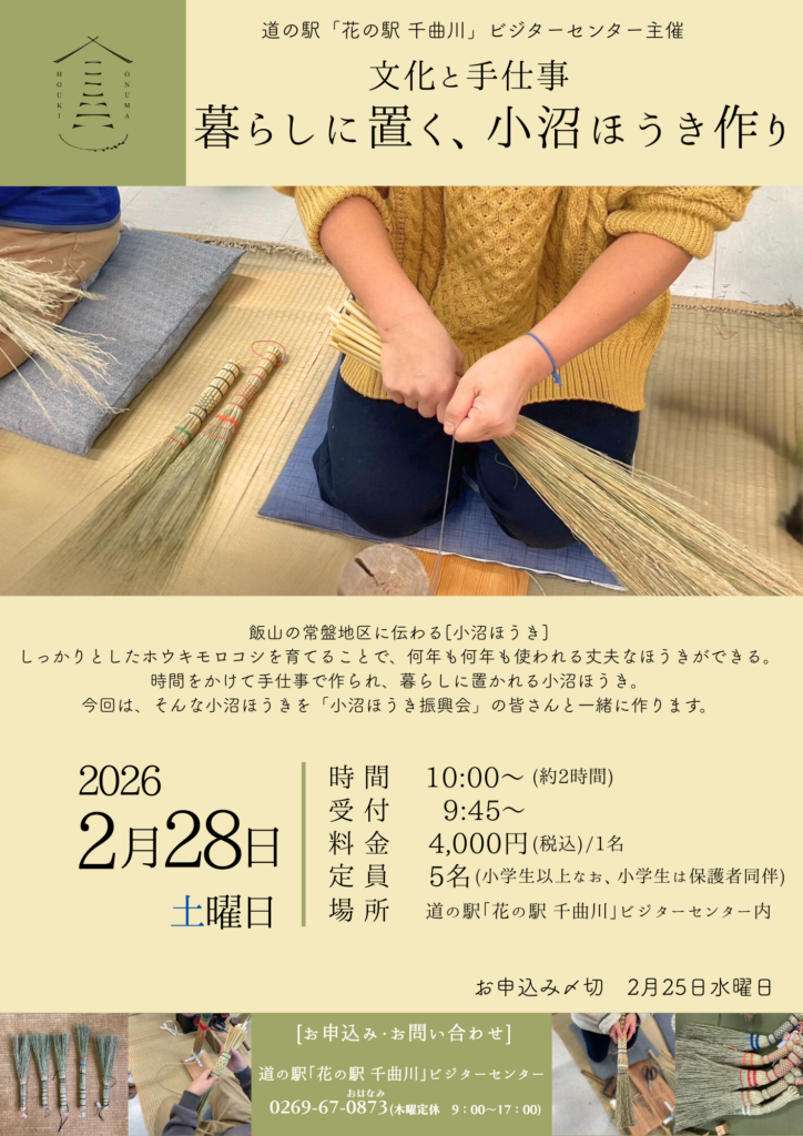 道の駅「花の駅 千曲川」ビジターセンターでは、長野県の伝統工芸品 「小沼ほうき」 の手仕事を体験できるワークショップを開催します。