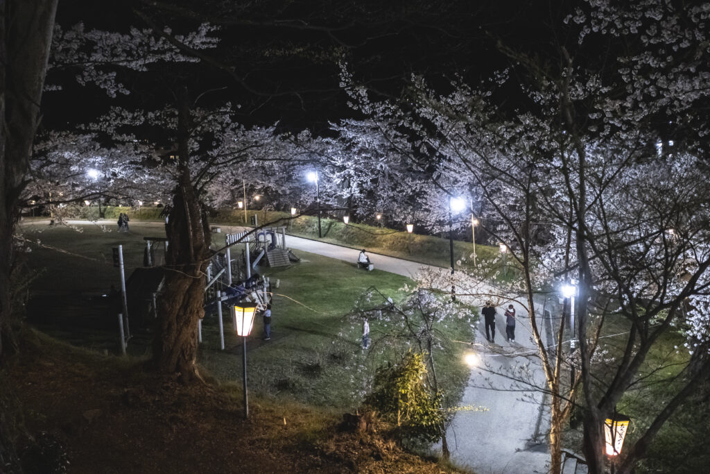 飯山城址公園では、三ノ丸・二ノ丸・本丸を中心に、約400本のソメイヨシノが咲き誇ります。夜にはぼんぼりが灯り、昼間とはまた違った幻想的な桜景色を楽しむことができます。