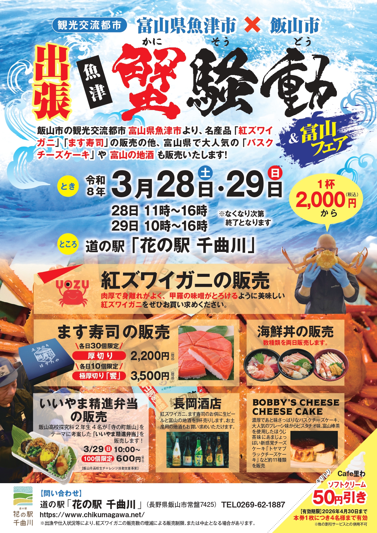 飯山市の観光交流都市である富山県魚津市から、富山の名産品やグルメが集まるイベント