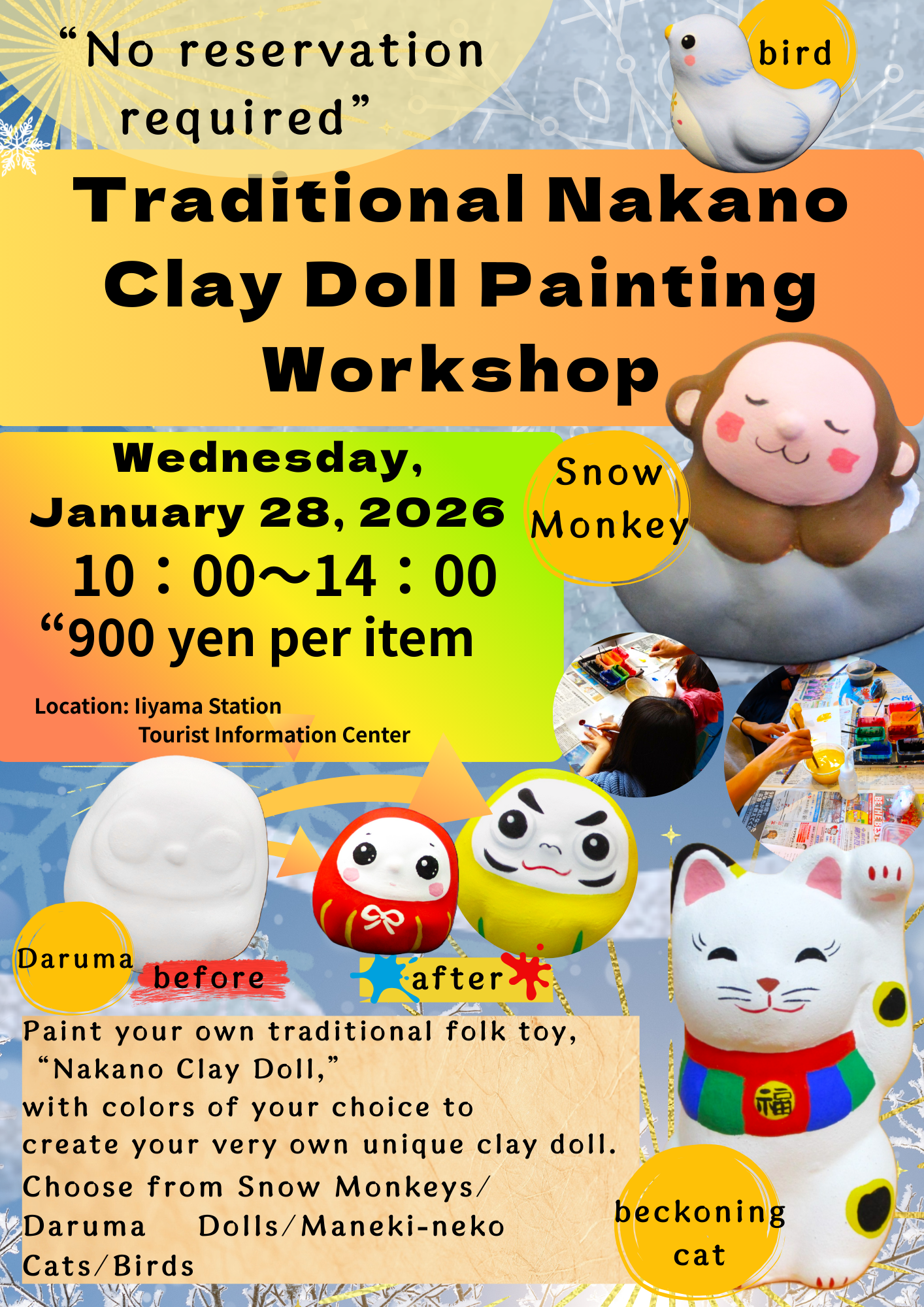 Paint your own traditional folk toy, the “Nakano Clay Doll,” using the colors of your choice to create a one‑of‑a‑kind piece.