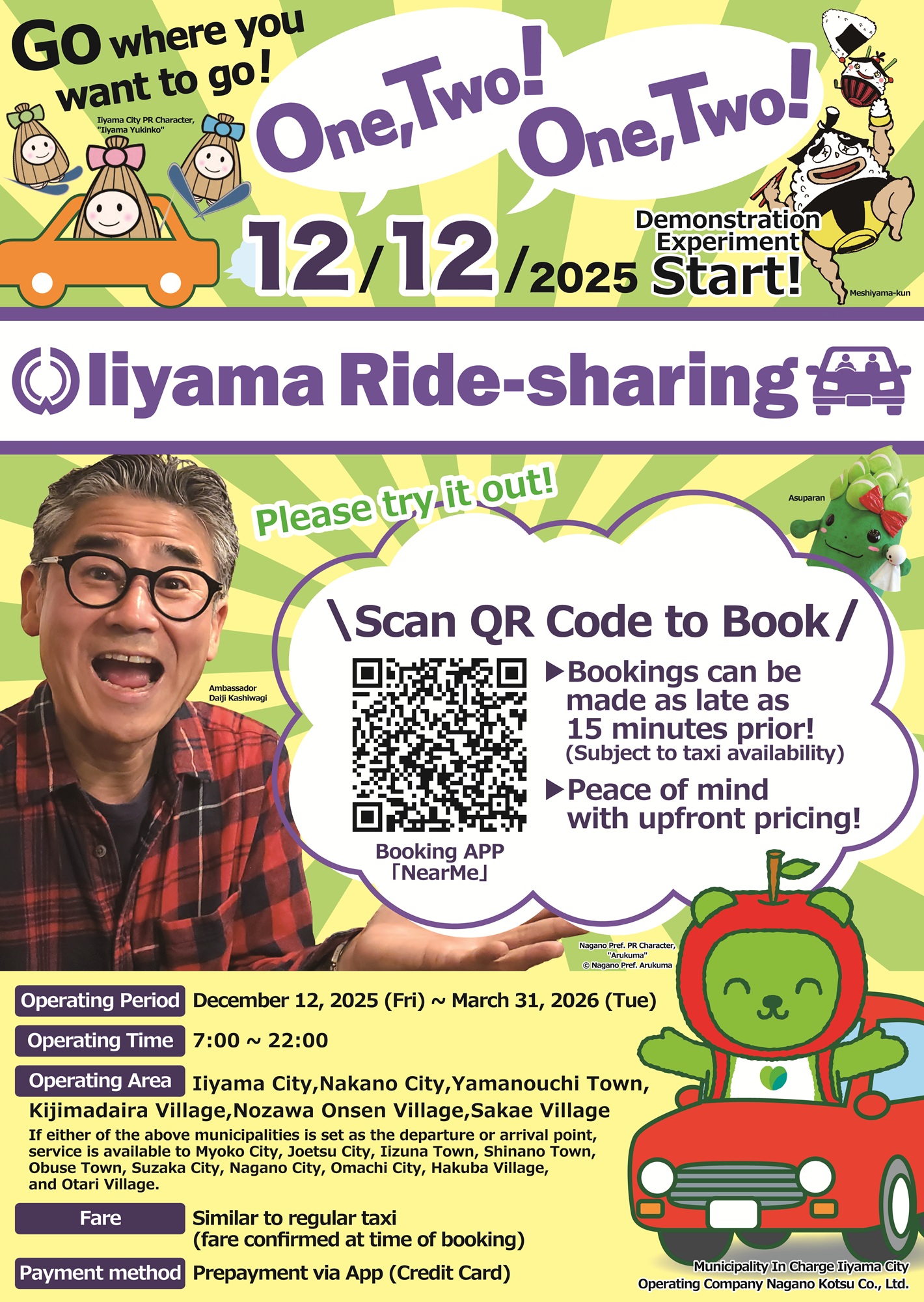 Iiyama City is currently conducting a pilot program for a new mobility service. Please feel free to use it as one of your transportation options during the winter season.