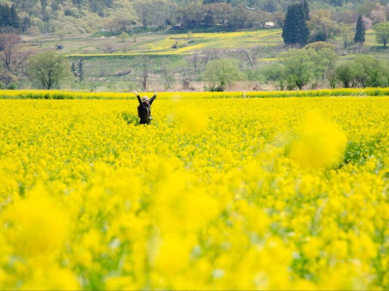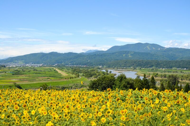 飯山市の春と言えば黄色の絨毯、菜の花畑。特に「菜の花公園」と道の駅「花の駅 千曲川」向かいの千曲川河川敷の菜の花が咲き誇る様子は圧巻です。