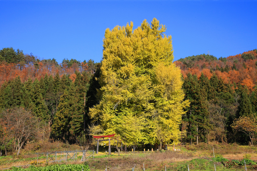 飯山市瑞穂地区の神戸(ごうど)集落を見守るように佇む、大きな大きなイチョウの木。それが、樹高36メートル、樹齢500年越と伝えられている巨木「神戸の大イチョウ」です。県内では最大、長野県天然記念物指定。大イチョウの根元の横には祠があり、昔から地区の人たちの心の拠り所にもなってきたことがわかります。