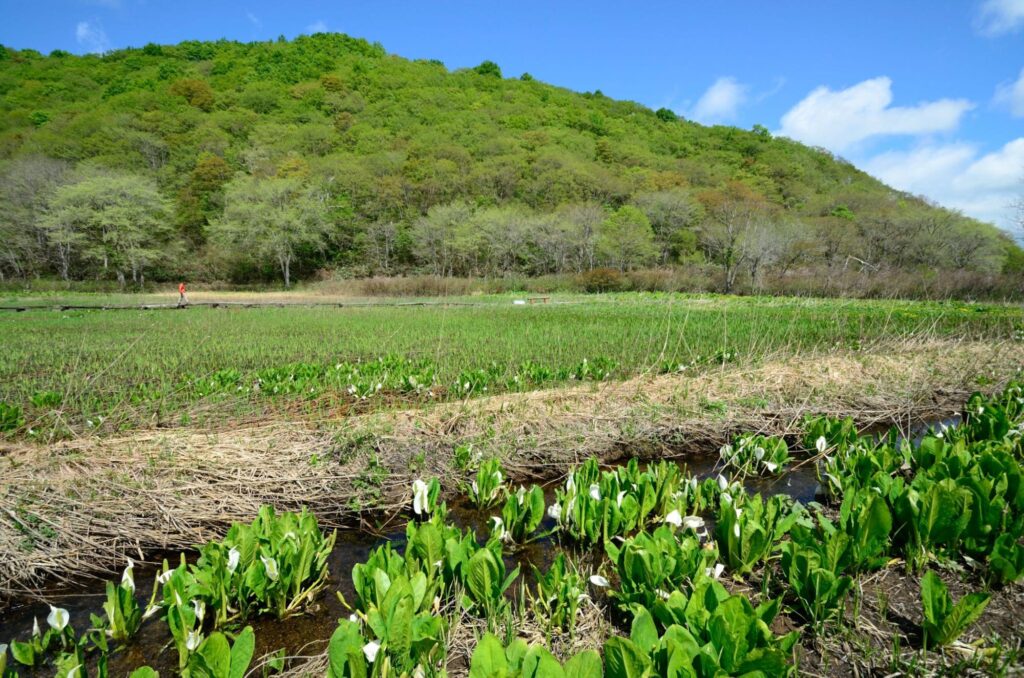 その年の積雪量にもよりますが、5月のミズバショウとリュウキンカ、湿原を取り囲む木々の鮮やかな新緑、そして残雪のコラボレーションが見事です。