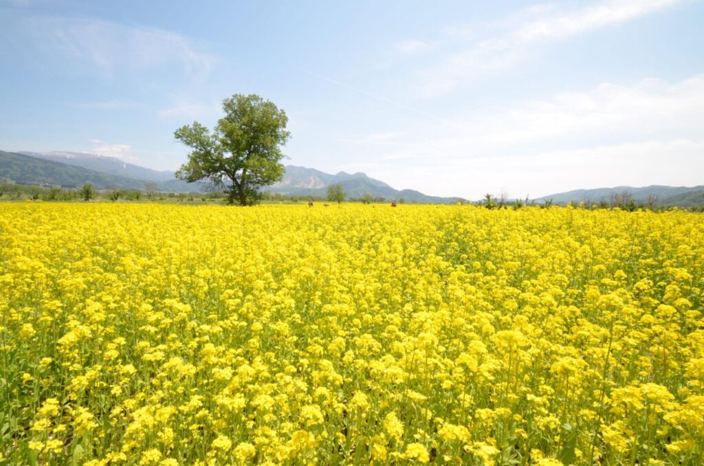 道の駅「花の駅 千曲川」から国道117号線を挟んだ向かい側には、一面の黄色い絨毯のような一面の菜の花畑が広がります。菜の花畑の中を歩くと、まるで絵本の世界に入り込んだかのよう。