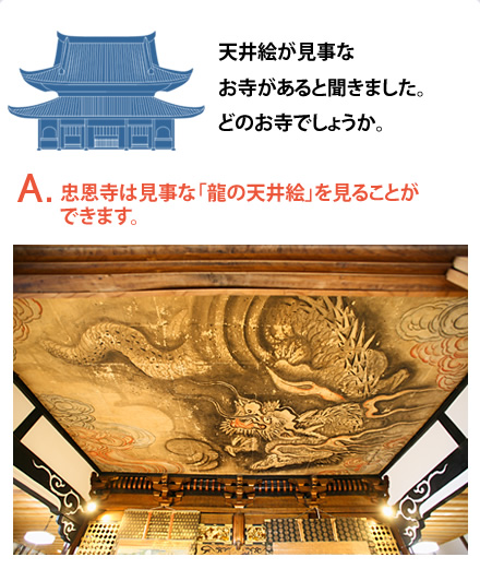 本堂は享保12(1727)年の大火で焼失、享保18(1733)年に再建されたもの。本堂内部の外陣天井には見事な「龍の天井絵」があり、厳粛な雰囲気が漂っています。